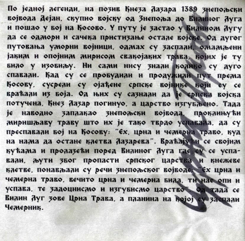 · Ali kada je 1389. godine, na poziv kneza Lazara, vojvoda Dejan, skupio vojsku od Znepolja i Zelenog grada do Vilinog Luga, i pošao u boj na Kosovo i u putu zastao u Vilinom Lugu da se odmori i sačeka pristizanje ostale vojske. Od dugog putovanja umorni vojnici odmah su zaspali, omamljeni jakim i prijatnim mirisom svakojake trave, koje u izobilju ovde ima. Ni sami nisu znali koliko su dugo, uz prijatan miris trave, zelenila šume, čistog vazduha i blizine žuborećih voda, spavali. Kada se Dejanova vojska probudila i produžila put prema Kosovu, na Dževrljanki (visu na Čemerniku) susretoše ojađene srpske vojnike koji su se žalosna i unezverena pogleda vraćali iz boja. Od njih doznadoše da je srpska vojska potučena, knez Lazar poginuo, a srpsko carstvo izgubljeno… Tada je, navodno, zaplako vojvoda Dejan, proklinjući mirišljavu travu što ih je tako tvrdo uspavala da su prespavali boj na Kosovu: ,,Eh, crna i čemerna travo, večito crna i čemerna bila, ti nas opi i uspava te za boj zadocnismo i izgubismo carstvo! Kud na nama da ostane kletva čestitoga cara Lazara?!”. Vraćajući se svojim kućama, prelazeći pored Vilinog Luga gde su se uspavali, ljuti zbog propasti srpskog carstva i kneževe kletve, srpski vojnici ponavljali su reči svog vojvode: ,,Eh, crna i čemerna travo, večito crna i čemerna bila, ti nas opi i uspava te zadocnismo i izgubismo carstvo!”… Od tada se Vilin lug zove Crna Trava, a planina koja se izna nje uzdiže – Čemernik.